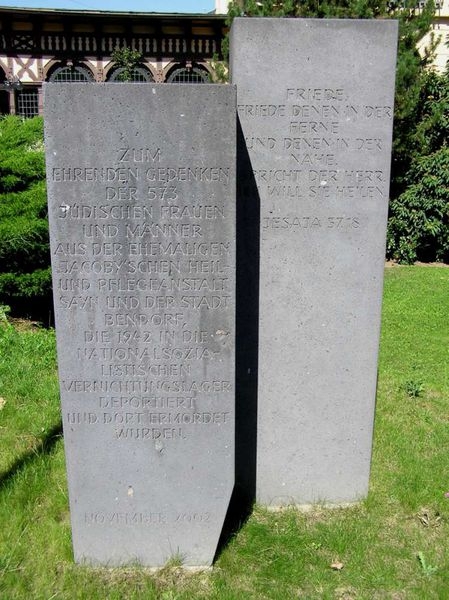Am 17. November 2002 wurde vor den Gebäuden Koblenz-Olper-Straße 39 in einer Feierstunde ein Denkmal der Öffentlichkeit übergeben. "Zum ehrenden Gedenken der 573 jüdischen Frauen und Männer aus der ehemaligen Jacoby'schen Heil- und Pflegeanstalt Sayn und der Stadt Bendorf, die 1942 in die nationalsozialistischen Vernichtungslager deportiert und dort ermordet wurden", lautet der Text auf einer der beiden von dem Bendorfer Künstler Beni Cohen-Or entworfenen, von dem Mayener Steinmetz Hans Joachim Hippel hergestellten Stelen. Die Kosten wurden durch Spenden aufgebracht. Eine Tafel mit den Namen aller deportierten Personen hängt im Inneren des "Wintergartens", des Verbindungsbaus der beiden Hauptgebäude.