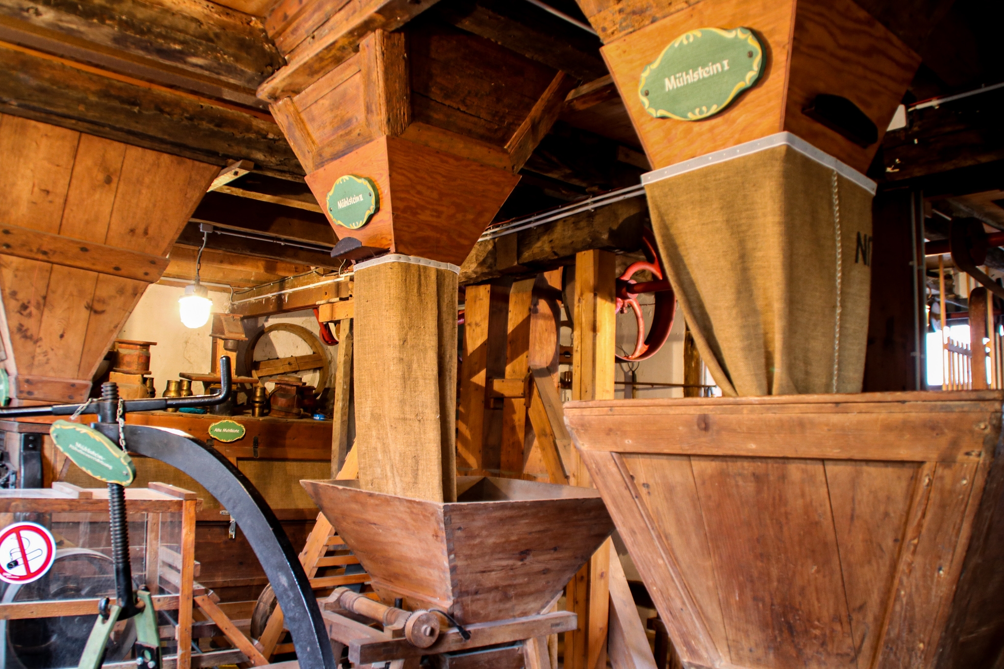 Das Mahlwerk der Kornmühle zwischen Wasserrad und Mühlstein erstreckt sich über drei Etagen. Das Mühlenmuseum ‚‚Hein's Mühle‘‘ zeigt und erläutert die verschiedenen Arbeitsschritte des Mahlprozesses sowie die Bedeutung des Müllerhandwerks in der Region.